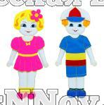 В набор входят: фигурки мальчика и девочки, костюмы, головные уборы, обувь, различающиеся по сезонам. Одежда крепится на липучках, сзади фигурок есть колечко для крепления на стену.