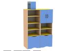 В двух цветовых сочетаниях: стойки бук-натур, фасады светло-синие, полки желтые ИЛИ стойки бук-натур, фасады манго, полки салатовые