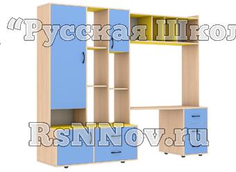 В двух цветовых сочетаниях: стойки бук-натур, фасады светло-синие, полки желтые ИЛИ стойки бук-натур, фасады манго, полки салатовые.