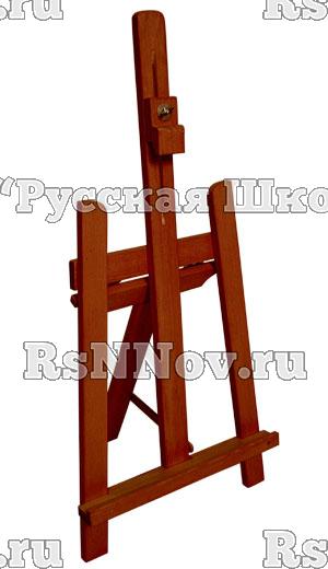 Складной мольберт-тренога с неподвижной полкой и подвижным бегунком. Идеально подходит для экспозиции небольших работ. Может быть выполнен из дуба или других твердых пород дерева.