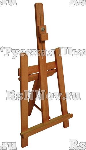 Складной мольберт-тренога с неподвижной полкой и подвижным бегунком. Идеально подходит для экспозиции небольших работ. Может быть выполнен из дуба или других твердых пород дерева.