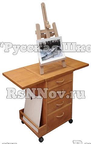 Тумбочка с 4-мя выдвижными ящиками для хранения красок, кистей, палитр, мастихинов и прочих аксессуаров художественного творчества с откидными дополнительными плоскостями и карманом для хранения больших палитр и бутылочных растворителей.