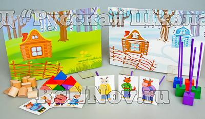 Комплектность: декорации формата А4 – 2 шт., карточки с персонажами формата 7*5 см – 8 шт., крепления для персонажей сказок – 8 шт., полуцилиндр неокрашенный – 12 шт., полуцилиндр окрашенный – 4 шт., призма треугольная неокрашенная -12 шт., призма треугольная окрашенная - 12 шт., держатели для декораций – 4 шт., скотч двухсторонний – 1 компл., руководство по эксплуатации – 1 шт., методические рекомендации для педагогов ДОО («Хрестоматия для дошкольников “Русские народные сказки”. Использование игровых наборов Фрёбеля при реализации ФГОС ДО». Авторы: В.В. Кожевникова, В.А. Киселева) - 1 шт.