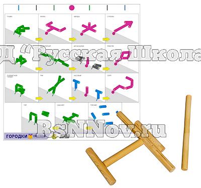 На коврике изображены 15 городошных фигур в порядке их освоения, а также нанесена разметка для правильной их постановки. Размер коврика, 80*80 см, совпадает с размером «города», используется для очерчивания игрового пространства. Коврик изготовлен из винила, легко сворачивается в рулон для хранения и транспортировки, а также легко разворачивается в рабочее положение. Рюхи и биты изготовлены из дерева.