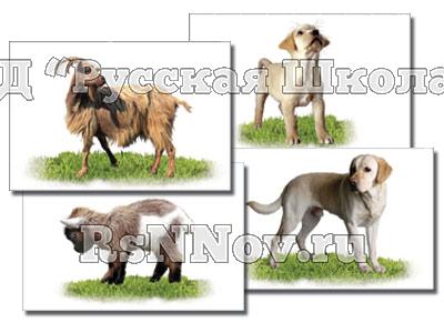 Комплектность: 7 пар карточек 10×15 см с фотографиями взрослых животных и их детенышей. На карточках изображены корова, теленок, овца, ягненок, свинья, поросенок, коза, козленок, лошадь, жеребенок, собака, щенок, кошка, котенок.