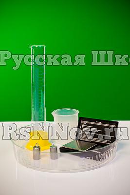 Комплектность: весы электронные – 1 шт., батарейки – 2 шт., измерительный цилиндр (250 мл, цена деления 2 мл) – 1 шт., стакан пластиковый с носиком (250 мл) – 1 шт., цилиндр № 1 стальной на нити (25,0±0,1 см3, 196±2 г) – 1 шт., цилиндр № 2 алюминиевый на нити (25,0±0,1 см3, 70±2 г) – 1 шт., лоток круглый пластиковый (Ø 29±0,5 см) – 1 шт., руководство по эксплуатации – 1 шт.