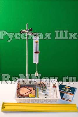Состав комплекта: секундомер электронный с двумя датчиками пложения (секундомер имеет цифровую индикацию, два способа запуска (вручную и датчиком), кнопки "старт/стоп" и "сброс", провод для подключения источника питания; датчики снабжены светодиодными индикаторами) - 1 шт., направляющая (длина 560 мм, ширина 73 мм) со шкалой для установки датчиков положения и пружины маятника - 1 шт., брусок деревянный с пусковым магнитом (брусок изготовлен из бука, имеет по 3 отверстия с двух сторон и два крючка, масса бруска (50±2) г, одна из поверхностей бруска имеет отличный от других коэффициент трения скольжения) - 1 шт., штатив (основание из бука, стойка алюминиевая длиной 50 см, диаметром 10 мм, муфта - 1 шт., лапка - 1 шт.) с креплением для наклонной плоскости (пластиковый стержень) - 1 шт., транспортир - 1 шт., нитяной маятник с грузом, с пусковым магнитом и с возможностью изменения длины нити (длина нити не менее 50 см) - 1 шт., бифилярный подвес - 1 шт., грузы массой по (100±2) г каждый - 4 шт., пружина № 1 с сантиметровой оцифровкой (с крючком для подвешивания грузов, пластиковым указателем растяжения по шкале и пластиковым стержнем для крепления в муфте штатива), жесткость (50±2) Н/м - 1 шт., пружина № 2 с сантиметровой оцифровкой (с крючком для подвешивания грузов, пластиковым указателем растяжения по шкале и пластиковым стержнем для крепления в муфте штатива), жесткость (20±2) Н/м - 1 шт., мерная лента, цена деления 1 мм - 1 шт., лоток пластиковый размером 340*270*55 мм - 1 шт., руководство по эксплуатации - 1 шт., учебное пособие - 1 шт.