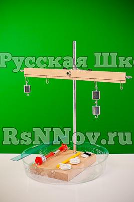 Рычаг имеет четыре подвеса, которые можно свободно перемещать вдоль рычага, а также при необходимости снимать с него. К подвесам крепят грузы. Уравновешивают рычаг с помощью гаек на торцевых шпильках. Ось рычага – металлическая трубка – крепится в муфте штатива. Неподвижный блок закреплен на оси, которая крепится в муфте штатива.