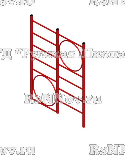 Выполнен из труб диаметром 27, 42 мм , металл имеет плавные радиусы ,тщательную обработку швов, покрыт порошковой краской красного цвета. Лаз представляет собой двухсекционную шведскую стенку , шаг перекладин 260 мм, имеется два стальных кольца диаметром 660 мм, в первой секции кольцо расположено в верхней части лаза, во второй секции - в нижней |