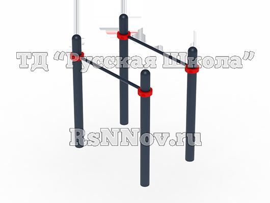 ГТО комплекс состоит из 4 опорных столбов высотой 1500 мм. Перекладины крепятся при помощи хомутов к опорным столбам. Расстояние между опорными столбами 600 мм.